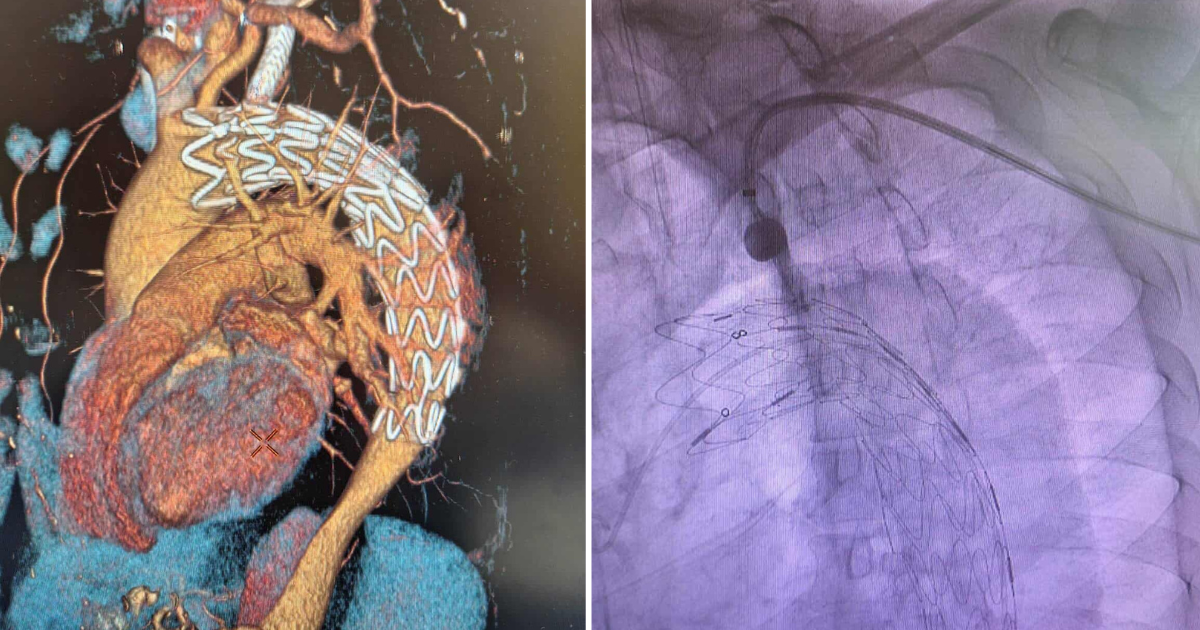 „Станува збор за интервенција при која се постави стент на делот од аортата кој беше заболен, при што интенционо со стентот се покри излезот во аортата за левата потклучна артерија за да се обезбеди стабилност на стентот во здрава аорта. Потоа преку артеријата на левата рака со посебна направа се направи отвор на стентот на ниво на аорта низ кој се постави нов стент кој обезбедува проток низ артеријата за левата рака. Со ова пациентот избегнува дополнителна операција на крвните садови на вратот (бајпас), избегнува двојна анестезија за краток временски интервал, крвозагуба, а и значајно се скратува рехабилитацијата. Интервенцијата помина во најдобар ред, а пациентот одлично ја поднесе и по два дена ја напушти болницата на домашно лекување“, објаснува д-р Лазовски.