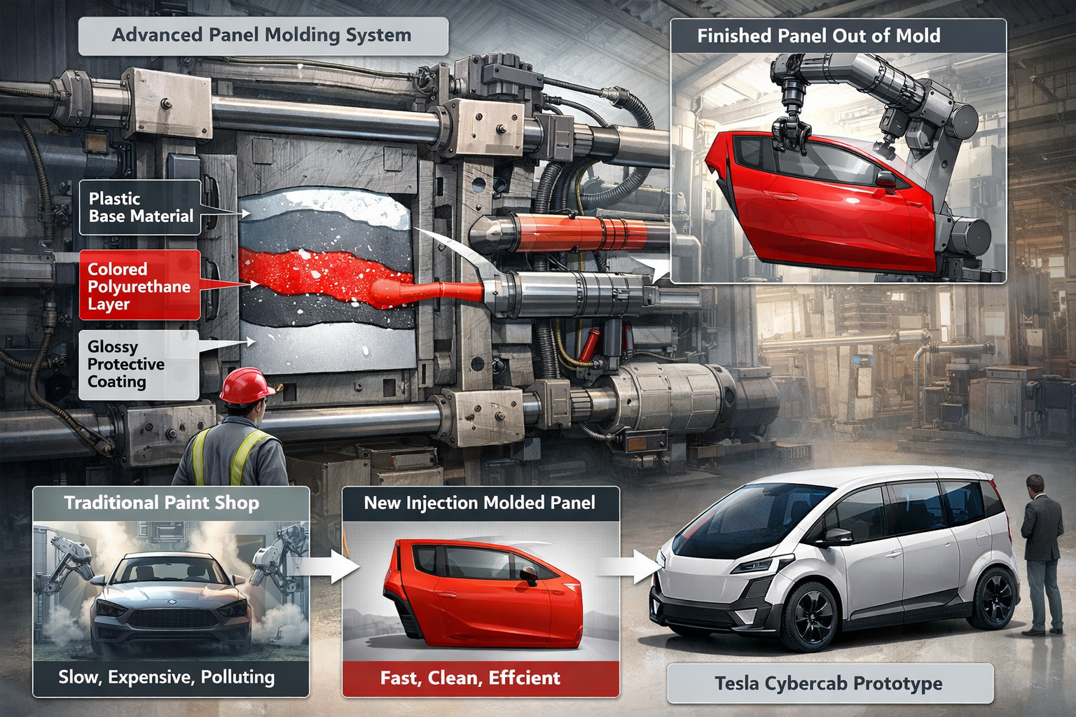 Наместо да се склопуваат метални или пластични панели и потоа да се носат во огромна бојадисница каде се прскаат слоеви боја, се пече во рерни и се полира со денови, компанијата разви процес каде бојата и заштитниот слој се ставаат директно во моментот кога се формира панелот.Сè е опишано во патентот WO 2025/151308. Голема машина, тешка преку сто тони, во еден ист метален калап прво влева основна пластична смеса која станува цврстиот дел од панелот – вратата, поклопецот, страничниот дел.