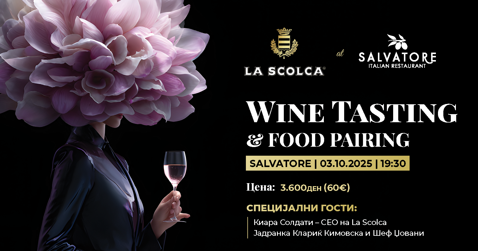 Компанијата „Алхемист“ и италијанскиот ресторан „Салваторе“ со задоволство ви најавуваат ексклузивен Wine Tasting & Food Pairing настан, кој ќе го спои најдоброто од италијанската кујна и винска традиција. Настанот ќе се одржи на 3 октомври (петок), со почеток во 19:30 часот, во уникатниот амбиент на ресторанот „Салваторе“.