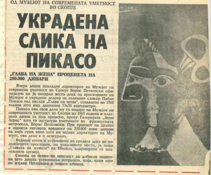 Вчера доцна попладне директорот на Музејот на современата уметност во Скопје Борис Петровски официјално ја потврди веста дека од просториите на Музејот е украдено делото на големиот сликар Пабло Пикасо под наслов „Глава на жена“, создадено во 1963 година што има димензии 73×55 сантиметри.
